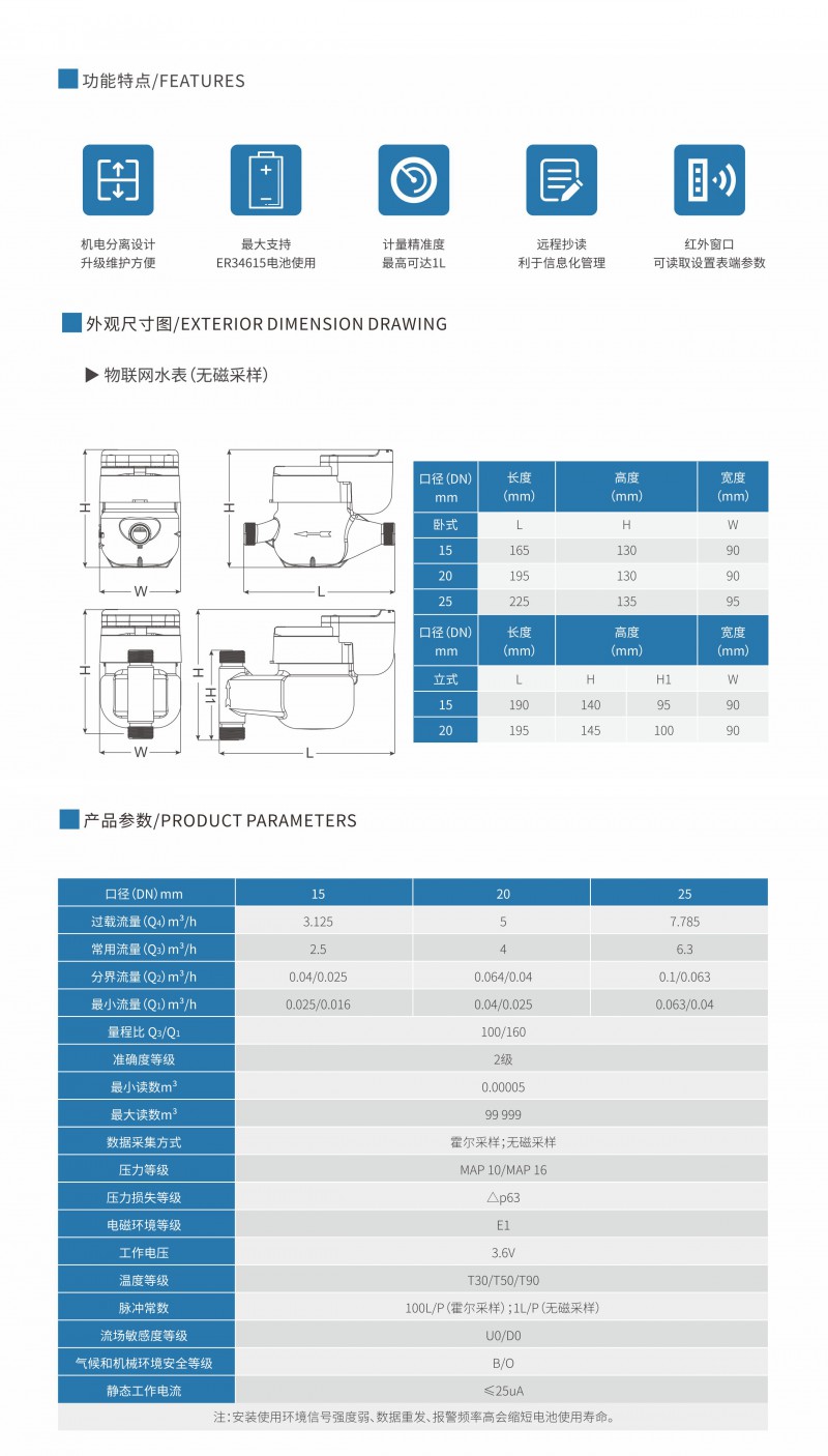 物联网水表是一款基于NB-Iot(Narrow Band Internet of Things,窄带蜂窝物联网)通讯技术的智能水表终端,具有计量稳定、通讯覆盖广、多连接、低成本、低功耗等特点,可以实现用水数据采集、分析,故障报警等功能,能显著提高供水管理及服务效率。 该系列产品提供卧式、立式两种类型用以满足不同的安装使用环境。 *球铁表壳、铜表壳、不锈钢表壳可供选择。