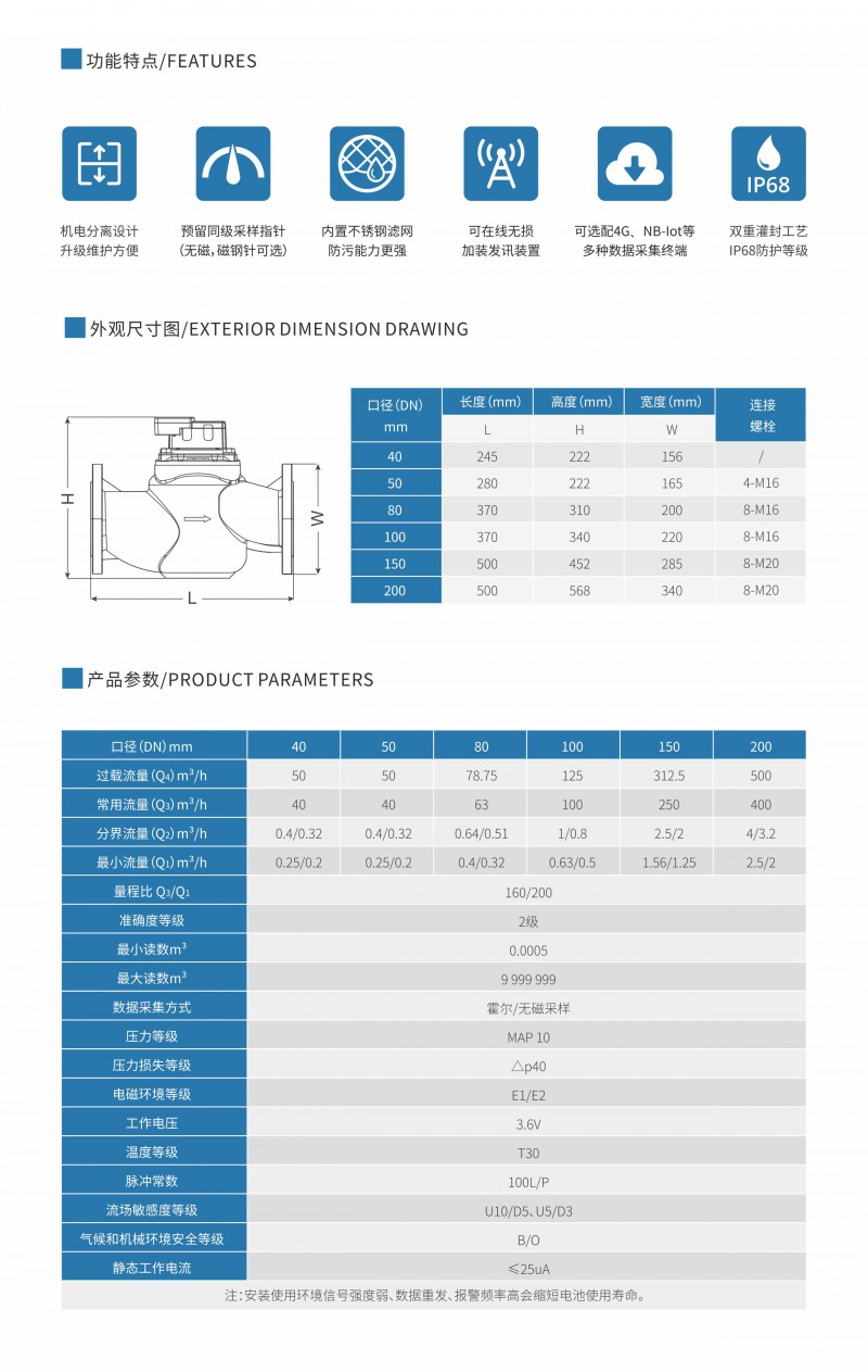 该系列产品采用垂直螺翼式结构,全流量检测,被测水流为轴向水流,低进高出,测量精度高,量程宽,计量稳定。可拆式液封机芯设计能保证水表读数清晰,且售后维护方便。预留无磁采样接口,可选配发讯装置,多种脉冲讯号输出(无磁、霍尔、磁阻),无损加装远传终端实现用水数据采集,用水分析,故障报警等功能,显著提高供水管理及服务效率。