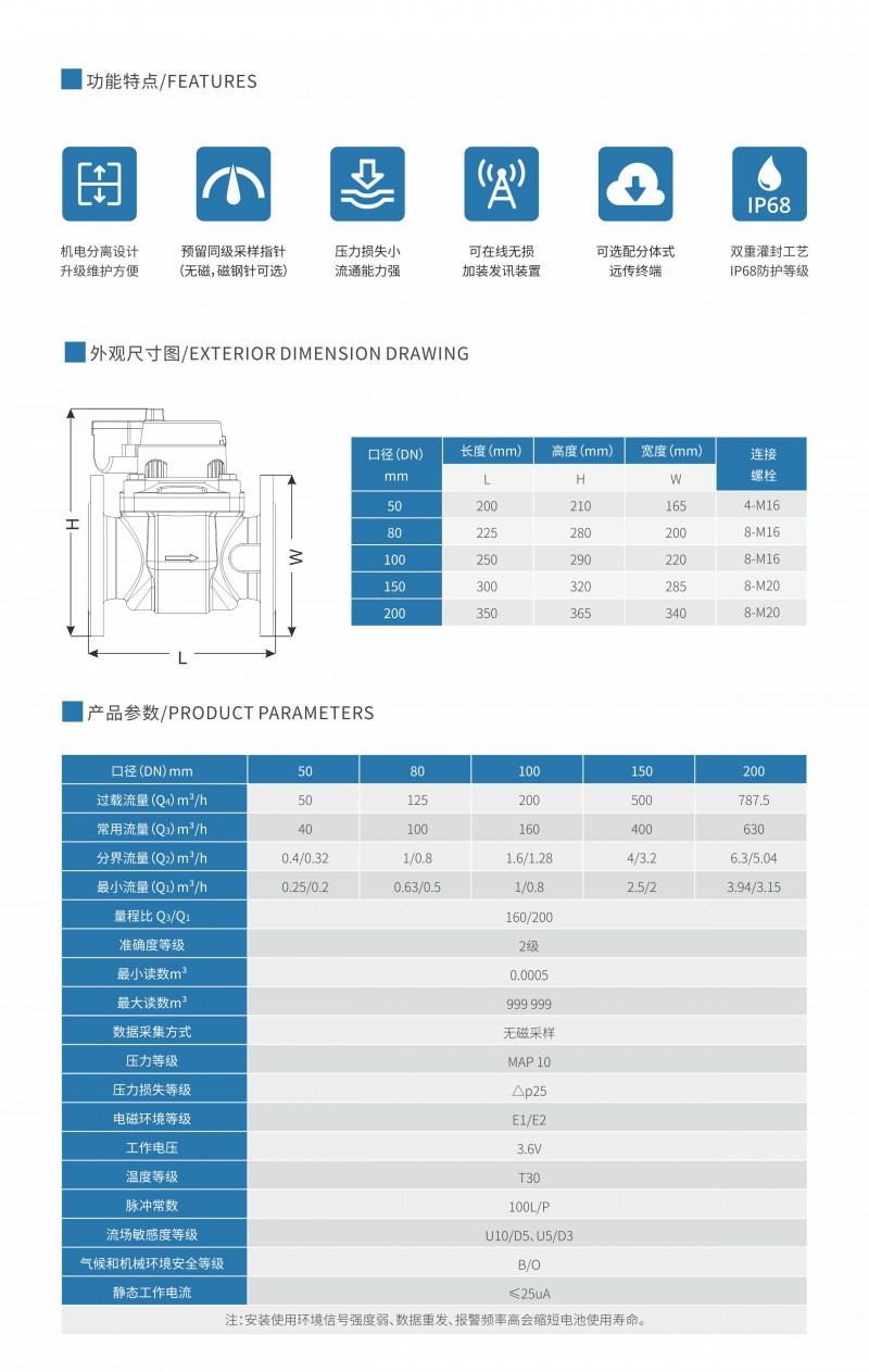 该系列产品采用水平螺翼式结构,全流量检测,被测水流为横向水流,进出水高度相同,测量精度高,量程宽,计量稳定。可拆式干式机芯设计能保证水表读数清晰,且售后维护方便。预留无磁采样接口,可选配发讯装置,多种脉冲讯号输出(无磁、霍尔、磁阻),无损加装远传终端实现用水数据采集,用水分析,故障报警等功能,显著提高供水管理及服务效率。