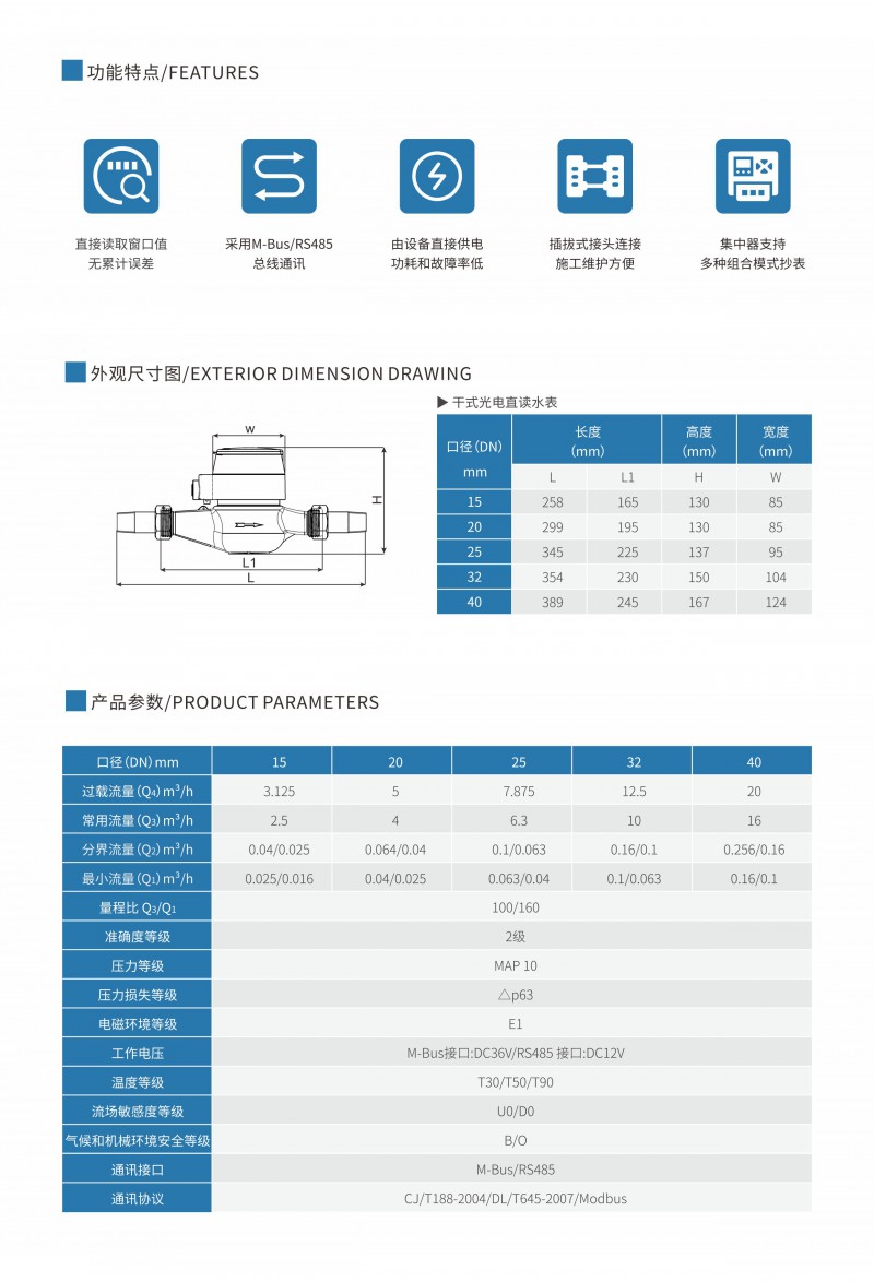 光电直读有线远传水表采用光学字轮识别(OCR)技术直接判读水表字轮读数;采用迟滞防抖动技术、准确计量、存储、传送用水量;采用M-Bus/RS485总线通讯,可实现远程抄控、支持阶梯水价,并且有布线简单、成本低、通讯成功率高等优点。