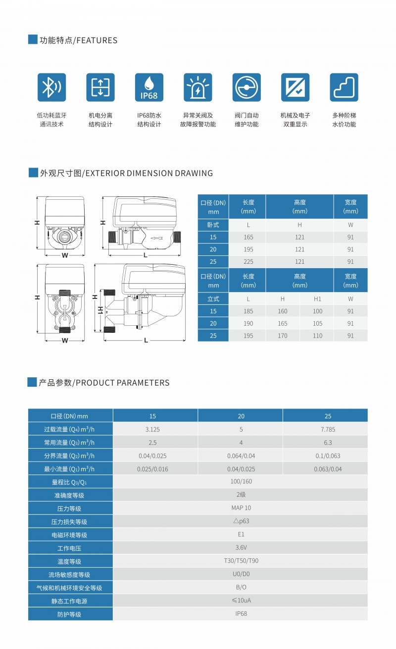 预付费蓝牙水表是一款基于BLE5.0低功耗蓝牙技术的预付费阀控水表。它支持微信、支付宝缴费,同时也可以通过收费窗口进行人工缴费。该表采用机电分离结构和IP68防水结构设计,具备安装维护简单、防护等级高、用户操作便、可靠耐用等特点。 该系列产品提供卧式、立式两种类型用以满足不同的安装使用环境。 *铜表壳、不锈钢表壳、塑料表壳可供选择