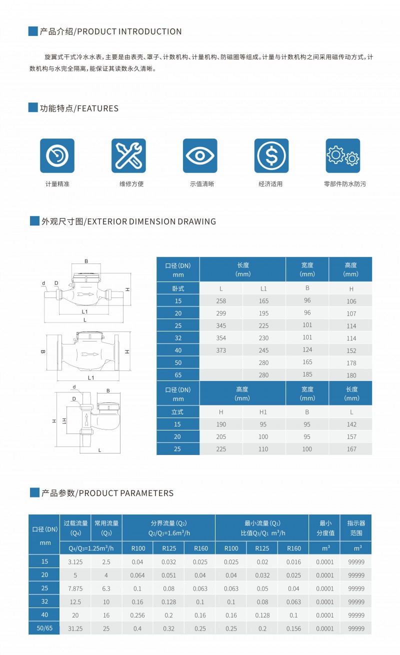 精确度高、计量准确、维修方便、技术指标达GB/T778.1~3-2018标准、液封系列计数器与被测水隔开能长期保持示值清晰、与水接触零部件采用优质防腐防污材料制作、DN15~40采用标准管螺纹、DN50以上采用法兰连接(铁壳)。
