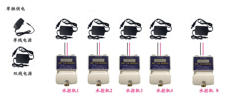 单独供电是1个电源带1台水控机,集中供电是1个集中电源带多台水控机,