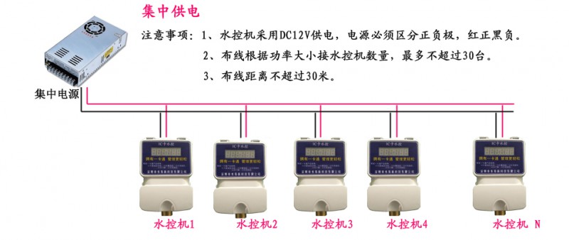 比如1个12V30A的集中电源可以供25台水控机同时工作,