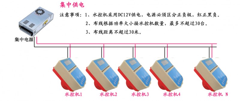 比如1个12V30A的集中电源可以供25台水控机同时工作,
