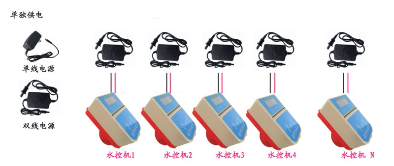 单独供电是1个电源带1台水控机,集中供电是1个集中电源带多台水控机,