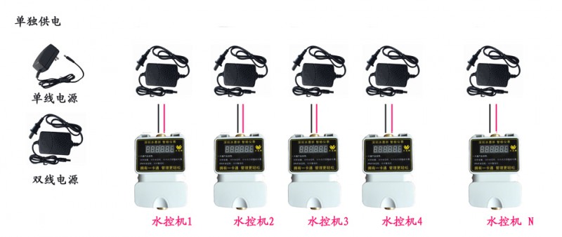 单独供电是1个电源带1台水控机,集中供电是1个集中电源带多台水控机,