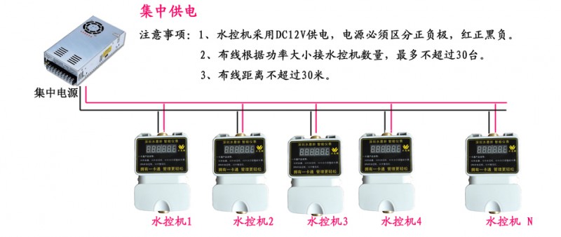 比如1个12V30A的集中电源可以供25台水控机同时工作,