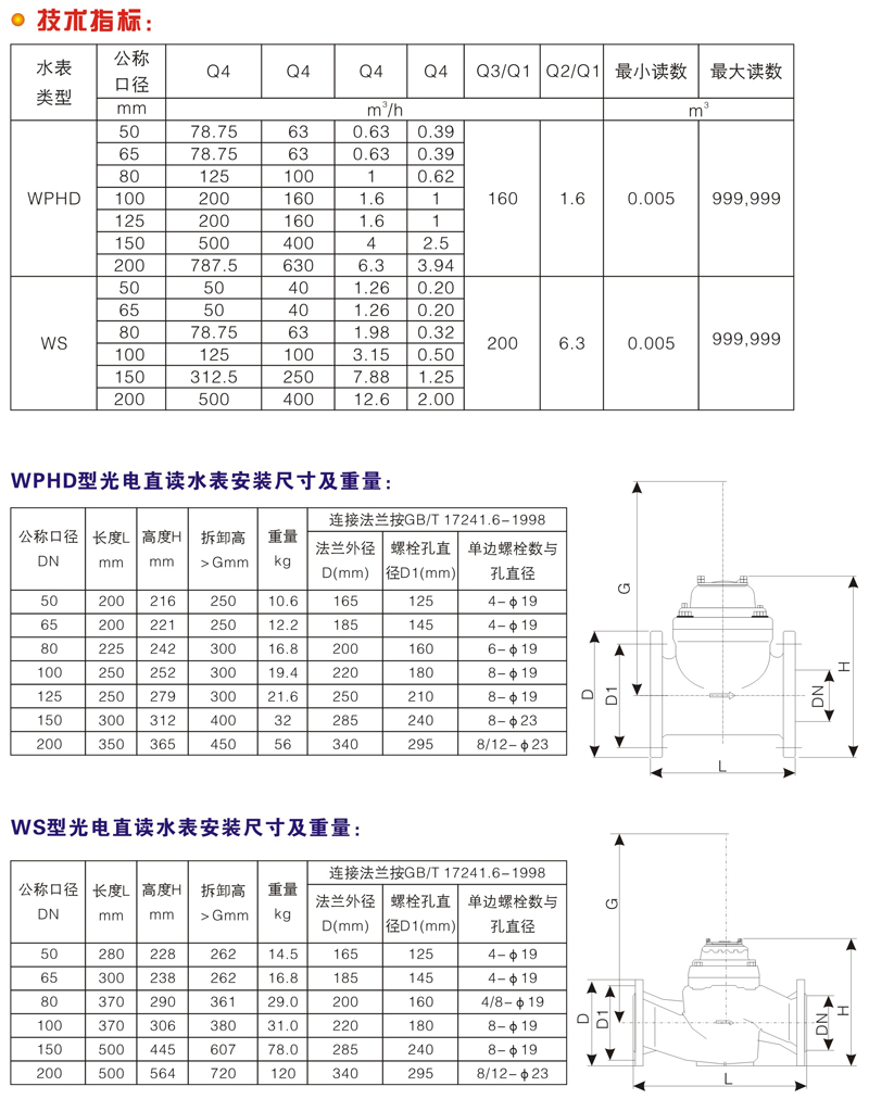 · WPHD则适用于特大流量的计量,壳体内腔带有整流功能,能有效降低水表前所安装的弯头、T型管变径管、滤水器、阀门等干扰件对水表测量精度的影响,抗扰流性能达到最高等级U0、Do。