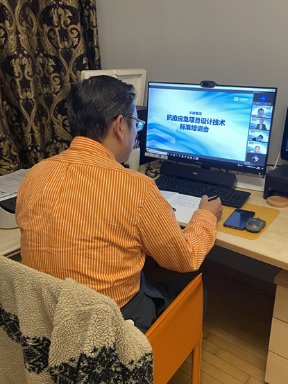 在临时拼接的书桌上,2个小时出方案、1个通宵出图纸、30多个小时主体基本完工、50多个小时不眠不休、多个应急项目连轴转;带领上海院技术团队4天时间完成《华建集团应急医疗建筑设计技术导则(试行)》中的《上海市临时集中隔离收治点设施设计技术导则(试行)》和《上海市应急医学隔离观察临时设施项目——箱式钢结构临时用房技术导则(试行)》两部分,后又编制完成《华建集团应急临时集中隔离收治点设施(篷房)设计技术导则(试行)》,为一线工程技术人员提供强有力的技术支撑。平时总是神采奕奕的陈总,直到累得趴在桌上,围绕他的是一堆工程图纸、一杯水和两只鸡蛋,这位满头白发的倔强的守“沪”者也从来没有说过:“我累了!”。