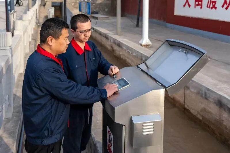 大禹渡灌区工作人员正在设置测控一体化闸门为农户开闸放水