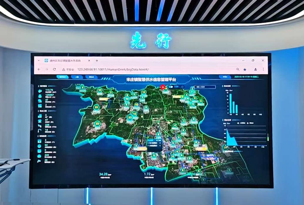 走进宋庄镇集体农场,一栋看似普通的平房内,却蕴藏着驱动全镇供水发展的“智慧大脑”。一块硕大的显示屏上所呈现的,正是“宋庄镇智慧供水信息管理平台”。“通过这个平台,我们可以随时掌握全镇供水水源情况,及时预警管网出现的问题,了解乡镇总体的水费账单和各村水费收缴情况等,还可以通过系统进行全镇供、用水数据分析……”工作人员介绍。