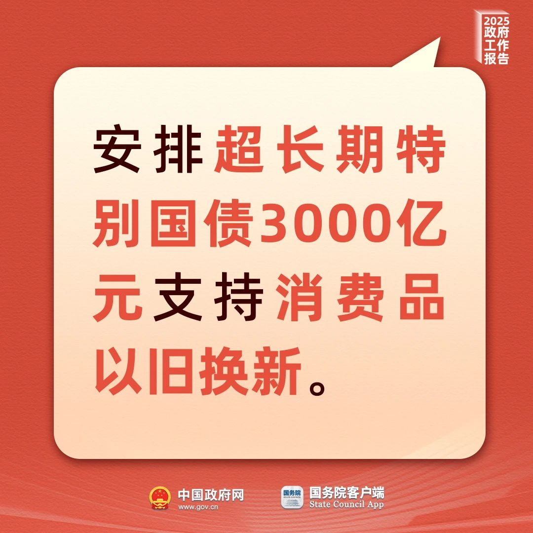 今年我们安排超长期特别国债3000亿元支持消费品以旧换新,这个规模可比24年翻了一倍。同时消费品以旧换新补贴的品种也扩大到了12种,覆盖范围还会进一步扩大到农村。