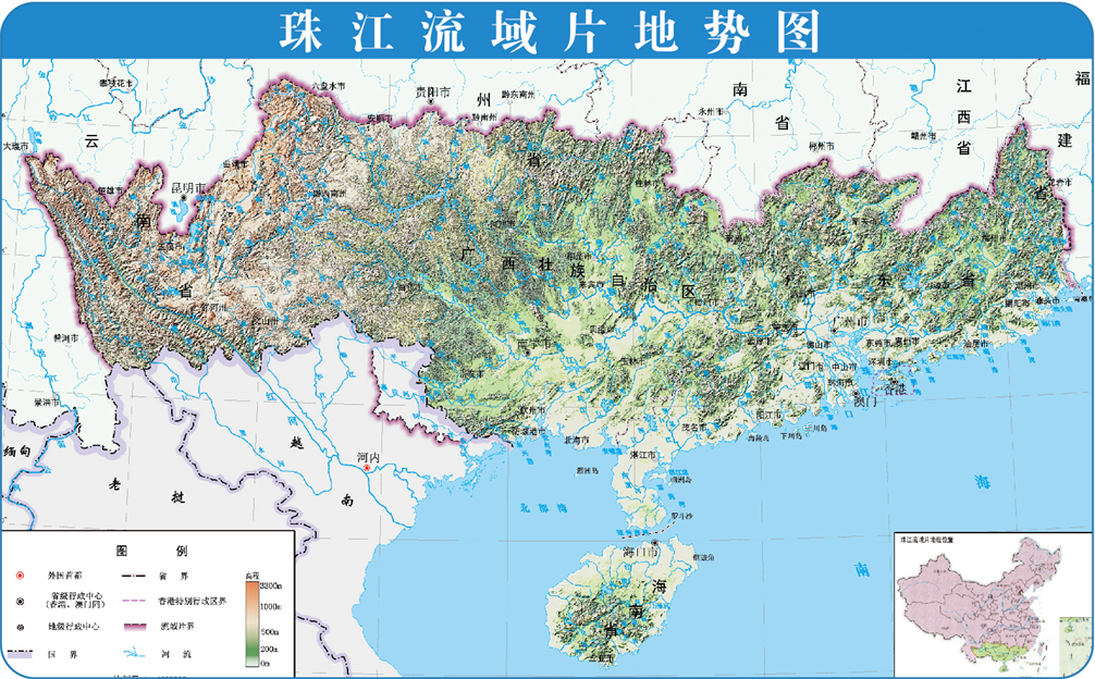 珠江流域内多为山地和丘陵,占总面积的94.5%,平原面积小而分散,仅占5.5%。总的地势是西北高,东南低。西北部为平均海拔1000~2000米的云贵高原,在高原上分布有盆地和湖泊群。高原边缘地区急流瀑布很多,其中以北盘江打帮河上源白水河上的黄果树瀑布最为著名。在云贵高原以东,是一片海拔在500米左右的低山丘陵,称两广丘陵。在广西以及云贵高原东部广泛分布着石灰岩,到处可以看到奇异的石林、深邃的洞穴和地下暗河,以云南的石林和桂林的山水最为典型。珠江下游的冲积平原是著名的珠江三角洲,河海交汇,河网交错,平畴绿野,美丽富饶,具有南国水乡的独特风貌。