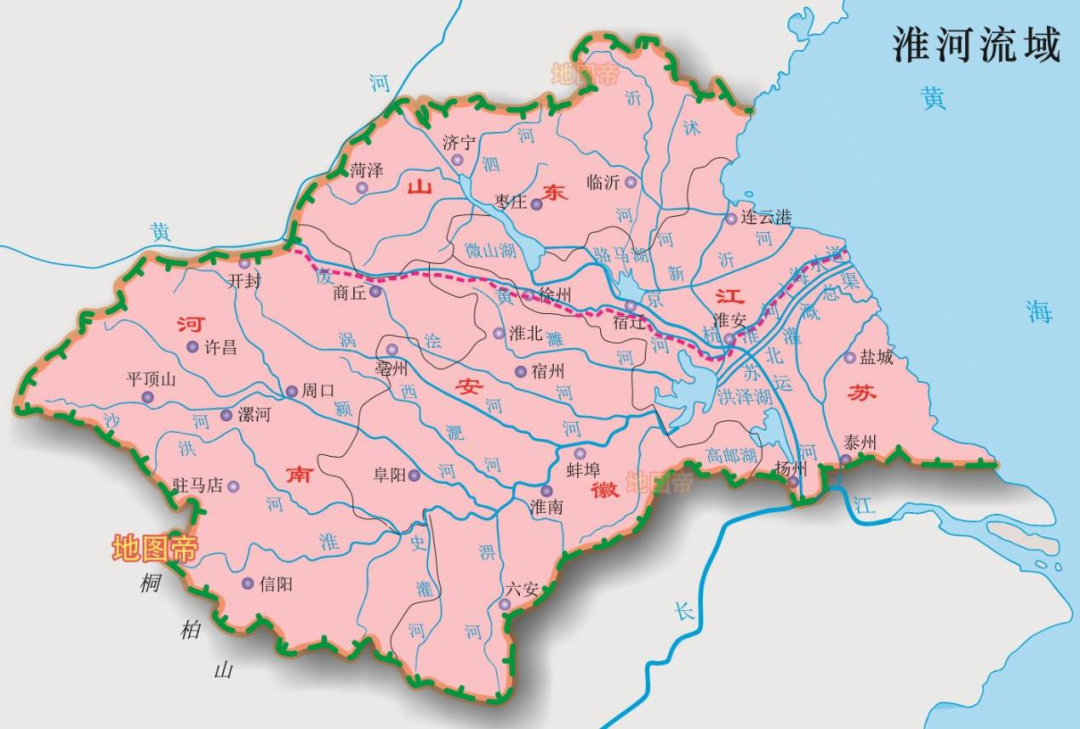 淮河发源于河南省桐柏山,自西向东流经河南、湖北、安徽、江苏4省,主流在江苏扬州三江营入长江,全长约1000千米,总落差200米。淮河下游主要有入江水道、入海水道、苏北灌溉总渠、分淮入沂水道和废黄河等出路。淮河上游河道比降大,中下游比降小,干流两侧多为湖泊、洼地,支流众多,整个水系呈扇形羽状不对称分布。沂沭泗河水系位于流域东北部,由沂河、沭河、泗运河组成,均发源于沂蒙山区,主要流经山东、江苏两省,经新沭河、新沂河东流入海。两大水系间有京杭运河、分淮入沂水道和徐洪河沟通。