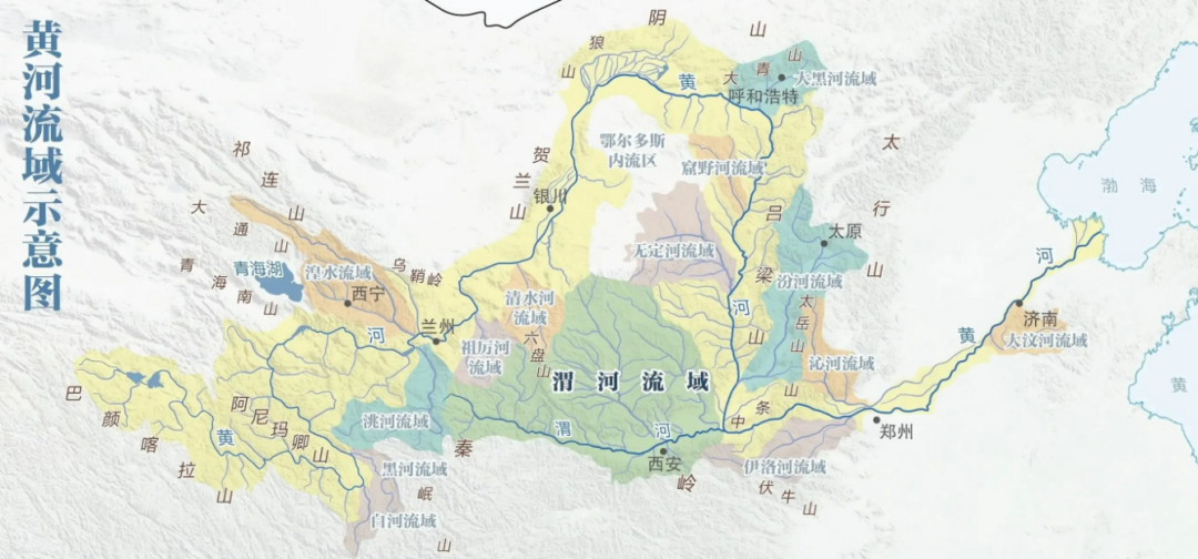 黄河上游指河源至贵德段,两岸多系山岭及草地高原,海拔均在3000米以上,高峰可超过4000米,河道呈“s”;黄河中游指贵德至孟津段,多经高山峡谷,水流迅急,坡降大,贵德到刘家峡山谷极为深削,河宽50~70米,最狭处不到15米,谷深100~500米,水流湍急,狭窄崖陡,蕴藏丰富的水力资源;黄河下游指河南郑州桃花峪以下的黄河河段,该段河长786千米,流域面积仅2.3万平方千米,占全流域面积的3%,下游河段总落差93.6米,平均比降0.12‰。由于黄河泥沙量大,每年平均净造陆地25至30平方公里,黄河下游河段长期淤积形成举世闻名的“地上悬河”。黄河主要支流有白河、黑河、湟水、祖厉河、清水河、大黑河、窟野河、无定河、汾河、渭河、洛河、沁河、大汶河等。