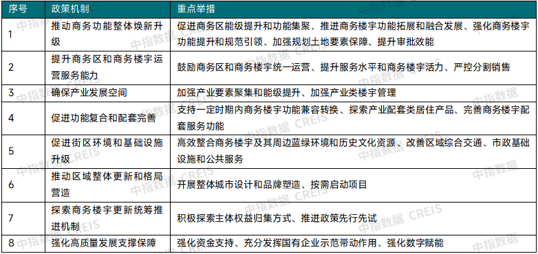 上海市《关于推进商务楼宇更新提升的实施意见》。2025年7月,上海发布《关于推进商务楼宇更新提升的实施意见》,针对商务楼宇更新提出“六项举措、两项机制”共八个方面的支持政策,涵盖推动商务功能整体焕新升级、提升商务区和商务楼宇运营服务能力、确保产业发展空间、促进功能复合和配套完善、促进街区环境和基础设施升级、推动区域整体更新和格局营造、探索商务楼宇更新统筹推进机制、强化高质量发展支撑保障,为解决传统商务楼宇功能单一、配套不齐的问题,支持存量商务楼宇分类兼容符合地区发展及人民生活需求的功能业态。
