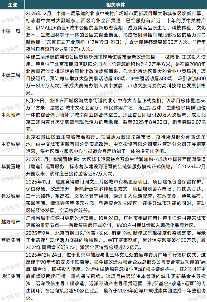 全国各地一批特色鲜明、模式多元的城市更新标杆项目接连落地、高效运营,为行业发展注入强劲动能。2025年6月,北京中海大吉巷正式开业,项目通过拆旧改造,打造传统与现代交融的城市更新典范,开业第一天就吸引了近20万客流,成为北京二环内兼具历史底蕴与现代活力的新地标。2025年9月,北京市首钢老工业区改造项目承办WTT中国大满贯,赛事期间园区累计消费额突破4100万元,较去年同期增长近50%,配套主题公园“大满贯公园”累计入园人数突破10万人次,较去年同期增幅达137%,大满贯公园消费额突破1000万元,园区整体活力与消费能级显著提升。贵阳市新华印刷厂危旧厂房提升改造入选2025年住建部《城市更新典型案例集(第二批)》,项目依托5栋存量建筑,布局1个4D体验文化中心、2座特色展馆、3大主题空间,在历史印记、工业遗存中融入新功能、新空间、新环境。自2024年5月开业以来,最高日客流量达12.8万人次,日均客流量约3.5万人次,累计客流量突破300万人次。已签约首店8家、品牌商家106家,年租赁收入突破2700万元,预计园内商家年总营收超1亿元、新增税收330万元,有效拉高周边地块商业和住房资产价值。天津市河北区中山北路片区城市更新项目是天津轨道交通集团在该区的首个城市更新项目,为河北区标志性城市更新项目,承载片区功能升级与形象焕新使命。项目以“TOD+城市更新”双轮驱动,依托轨道站点一体化开发,助力河北区打造城市副中心、焕新“百年中山路”。通过打通2条断头路改善交通,规划TOD特色街区补充便民服务、休闲娱乐等多元配套,切实提升居民生活品质与幸福感。