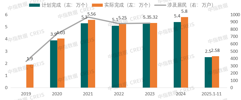 图:2019~2025年(1-11月)全国老旧小区改造计划及实际完成情况
