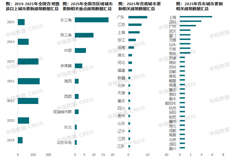 根据中指研究院的监测,近几年城市更新政策出台的数量均较多。从各市政策数量变化情况来看,2021、2022、2023年是各地城市更新政策出台的高峰期,年度出台的市级政策数量均在130项左右。2024、2025年各地政策数量明显下降,但个别城市政策数量增长明显。整体来看,2025年各地的城市更新政策更加注重项目落地的可行性与可持续性。具体呈现4个方面的特点。第一,多地出台中长期行动方案,明确更新路径与时间节点,如重庆《持续推进城市更新三年行动计划(2025-2027年)》、武汉《“五改四好”高质量城市更新行动方案(2025—2027年)》等,为城市更新划定清晰蓝图。第二,政策体系不断完善,覆盖项目规划、资金支持、土地利用、项目审批等全流程,例如北京推出《北京市城市更新政策激励工具箱(1.0版)》、青岛发布《优化城市更新项目审批流程实施方案(试行)》,破解实施堵点。第三,聚焦重点领域精准发力,老旧小区、城中村、低效楼宇/产业用地成为核心抓手,广州、汕头等多地出台专项政策,同步兼顾历史文化保护。第四,试点示范与机制创新并行,江苏、四川等公布省级试点项目名单,推动政策落地见效。