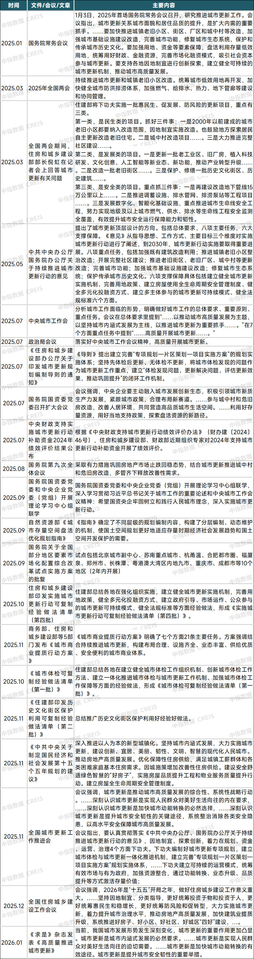 中央财政支持方面,一是中央财政城市更新专项补助。2025年4月,财政部、住建部联合印发《关于开展2025年度中央财政支持实施城市更新行动的通知》,并在5月份公布了第二批城市更新行动评审结果。北京、天津、唐山、包头、大连、哈尔滨、苏州、温州、芜湖、厦门、济南、郑州、宜昌、长沙、广州、海口、宜宾、兰州、西宁、乌鲁木齐等20个城市成功入选新一批名单,补助总额超过200亿元。其中东部地区每个城市补助总额不超过8亿元,中部地区每个城市补助总额不超过10亿元,西部地区每个城市补助总额不超过12亿元,直辖市每个城市补助总额不超过12亿元。从入围城市名单来看,2024年与2025年名单无任何城市重叠,表明中央财政支持城市更新行动是年度性评选,每年选择不同城市,避免重复资助,以扩大覆盖范围。二是中央预算内投资城市更新专项资金。2025年国家发展改革委下达中央预算内投资城市更新专项资金800亿元,以支持各地城镇老旧小区改造、城市危旧房改造等项目建设,共涉及约550万户居民,受益人数约1700万人。三是超长期特别国债。2025年我国已通过“两重”建设(国家重大战略实施和重点领域安全能力建设)安排超长期特别国债1350亿元,支持各地建设改造城市燃气、排水、供水、供热等地下管网约14.8万公里。2025年12月31日,国家发展改革委例行新闻发布会上表示,抓紧组织下达2026年提前批“两重”建设项目清单和中央预算内投资计划,共计约2950亿元。“两重”建设方面,强化“两重”性质、坚持自上而下、注重软硬结合,共安排约2200亿元,支持城市地下管网、高标准农田、“三北”工程、有效降低全社会物流成本等领域的281个项目。中央预算内投资方面,聚焦需要集中力量、持续投入、补短板调结构惠民生的公共领域,安排超过750亿元,支持城市更新、水利、生态保护修复、污染治理、节能降碳等方面的673个项目,充分发挥政府投资引导带动作用。财政贴息方面,2025年7月,江苏省提高“城新贷”财政贴息标准,对2025年1月1日后放款的、符合条件的贷款项目由省财政贴息1.5个百分点。截至2025年9月,“城新贷”发放贷款179.13亿元,已拨付3.29亿元贴息资金、惠及183家企业(项目),精准对接老旧小区改造、基础设施升级、产城融合发展等重点项目。城市更新专项债方面,2025年前三季度,全国已经发行的新增地方专项债中,保障性安居工程、保障性租赁住房、城镇老旧小区改造、棚户区改造、土地储备等房地产相关的专项债发行约6400亿元,同比增长89%,其中,城镇老旧小区改造、棚户区改造专项债分别为632亿元、1302亿元,涉及城中村改造的专项债发行816亿元,同比增长1.4倍。政策性信贷资金方面,国开行2025年发放城市建设领域贷款1.16万亿元,截至2025年末在城市建设领域贷款余额6.3万亿元。农发行2025年累计发放城中村改造专项借款超过4700亿元;历时不到1个月的时间高效完成1500亿元新型政策性金融工具基金投放任务,支持项目881个,预计可拉动项目总投资1.93万亿元。商业银行贷款方面,截至2025年三季度末,浦发银行城市更新贷款余额超1600亿元,落地项目超200个。工商银行2025年设立1000亿元城市更新专项信贷额度,对符合条件的项目给予基准利率下浮10%-20%的优惠。2025年5月金融监管总局表示,将研究出台城市更新项目贷款管理办法,明确贷款条件标准,满足城市更新行动金融需求,提高金融服务的及时性和有效性。2026年1月,住建部部长倪虹在《求是》发表署名文章《高质量推进城市更新》中提到,要积极引入社会资金,鼓励金融机构创新金融工具,开发金融产品,提供长周期、低利率的信贷资金。不动产投资信托基金方面,2025年2月,城市更