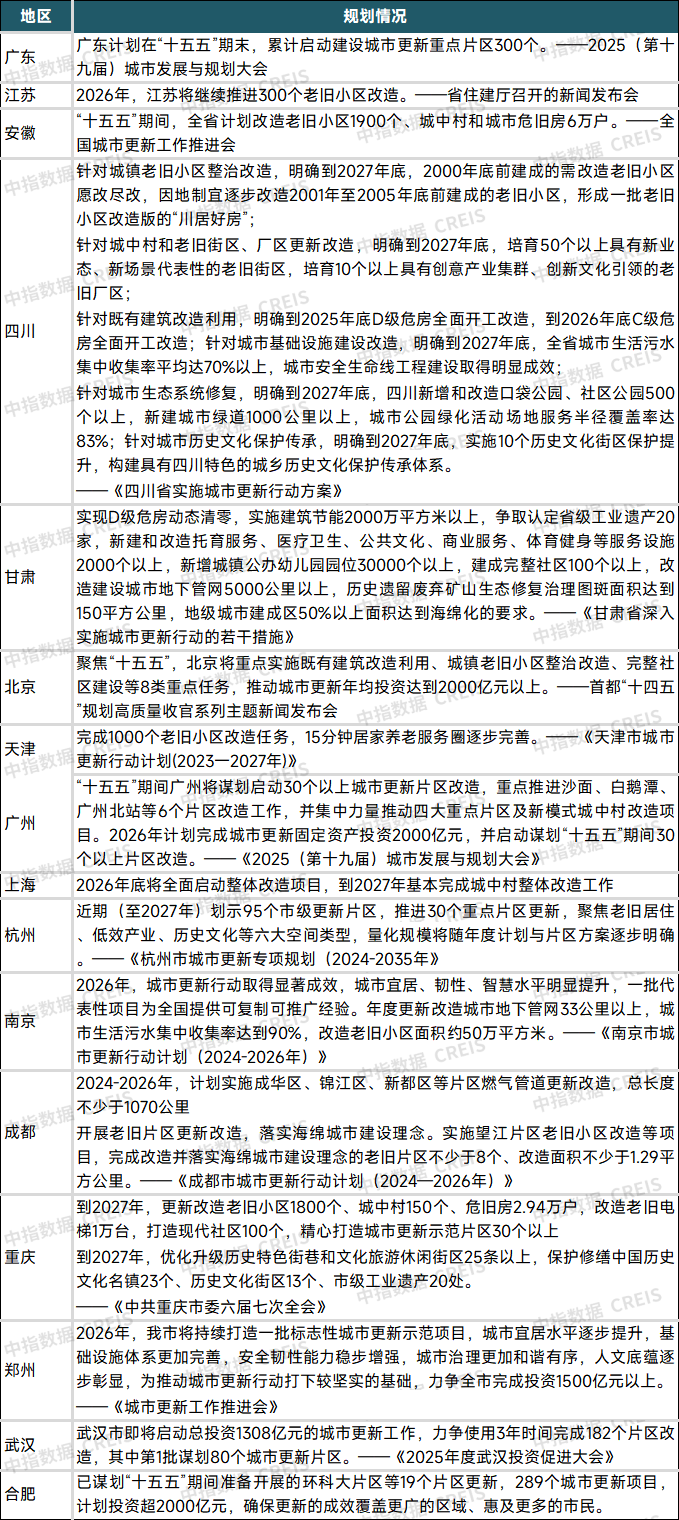 城市更新规模方面,当前各个城市“十五五”城市更新专项规划仍在编制中,从目前已公布的各地“十五五”期间或近期城市更新规模来看,有以下三个特征。一是片区化统筹特征明显,多数城市明确划定重点更新片区,通过整合空间资源、优化功能布局,实现生产、生活、生态空间的协同升级。广东计划“十五五”期末累计启动300个城市更新重点片区,广州聚焦沙面、白鹅潭等6个核心片区推进改造,杭州划定95个市级更新片区并重点推进30个,武汉则以182个片区为载体启动整体更新。二是涉及生命安全的“里子”工程更加重视。地下管网、生态修复成为高频任务。甘肃计划改造建设城市地下管网5000公里以上,成都推进不少于1070公里燃气管道更新,南京年度改造地下管网33公里以上;生态修复领域,四川明确新增改造口袋公园、社区公园500个以上,新建城市绿道1000公里以上,甘肃则完成150平方公里历史遗留废弃矿山生态修复,成都、南京等城市还将海绵城市理念融入改造全过程。三是多元场景融合,兼顾产业升级与文化传承。产业升级方面,多地聚焦低效产业空间盘活,培育新业态新动能。四川计划到2027年底培育50个以上新型老旧街区、10个以上创意产业集群老旧厂区;重庆将优化升级25条以上文化旅游休闲街区,保护修缮20处市级工业遗产;北京则通过既有建筑改造利用,为智能制造、数字经济等新兴产业释放空间载体。这种“产业赋能型”更新模式,成为推动区域经济转型的重要抓手。文化传承方面,各地注重保留城市记忆,构建特色文化体系。四川将实施10个历史文化街区保护提升,重庆修缮23个中国历史文化名镇、13个历史文化街区,广州、杭州等历史文化名城也将历史文化片区纳入重点更新范围,实现“修旧如旧”与功能焕新的统一,避免千城一面。