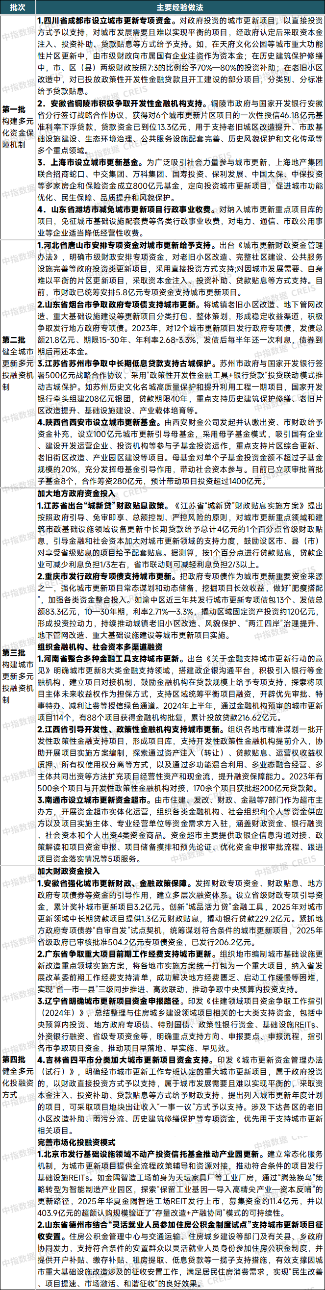 结合住建部历次发布的实施城市更新行动可复制经验做法清单来看,多批次的城市更新可复制经验做法均提到构建城市更新多元投融资机制。各地针对构建可持续的资金来源进行了持续性探索。包括四川省成都市设立城市更新专项资金,广东省争取重大项目前期工作经费支持城市更新,江苏省出台“城新贷”财政贴息政策,河南省整合多种金融工具支持城市更新,江西省引导开发性、政策性金融机构支持城市更新,上海、西安设立城市更新基金,北京市发行基础设施领域不动产投资信托基金、唐山市安排专项资金对城市更新给予支持,烟台市、重庆市通过政府专项债支持城市更新,苏州市争取中长期低息贷款支持古城保护,南通市设立城市更新资金超市等多方式探索,体现了各地对加速构建可持续更新模式的重视。