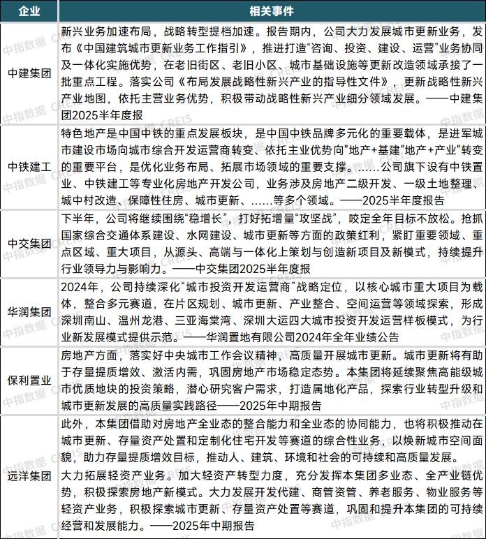 从部分企业城市更新动态及战略导向来看,目前建筑、房地产开发类企业参与城市更新呈现四大特点。一是项目由传统拆建,转向品质运营,注重场景营造与文化传承。项目彻底告别传统大拆大建模式,注重空间功能迭代与长期经营性现金流平衡,居民情感生活与历史文脉活化成为更新核心底色,推动城市从物理空间焕新迈向情感寄托的内涵式高质量发展。二是行业竞争从单纯项目争夺转向差异化品牌构建。企业通过标杆项目输出更新理念与运营标准,推动城市更新从“单点改造”走向“品牌营造”,同时文化传承、社区融合等指标纳入价值评估核心,在做好项目落地的同时打响自身城市更新品牌。三是企业布局聚焦高能级核心城市和区域深耕。北京、深圳、广州等核心城市成为企业角逐的核心赛道,多家企业聚焦自身深耕区域,形成核心城市重点突破、区域资源深度整合的布局态势。四是城市更新重点领域的变化为建筑型企业带来发展红利。建筑企业迎来城市更新项目涉及老旧小区改造、历史街区活化、产业园区升级等多个复杂领域,对参与企业施工能力、业务范围、合规运营能力有着严格要求,建筑企业凭借自身多年积累的行业经验、开发资质优势、产业链整合能力迎来巨大红利。