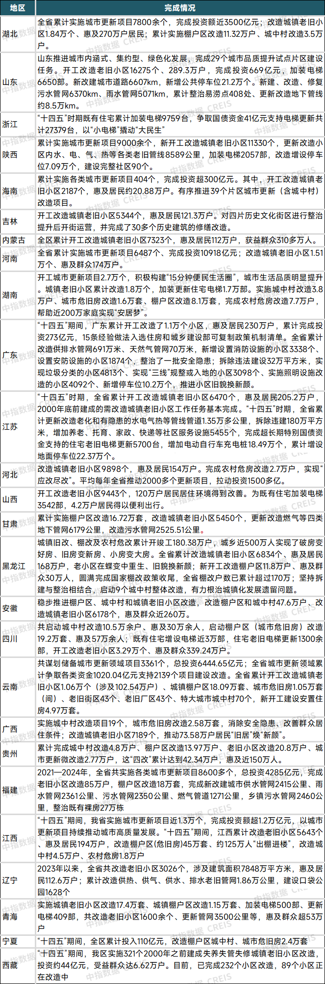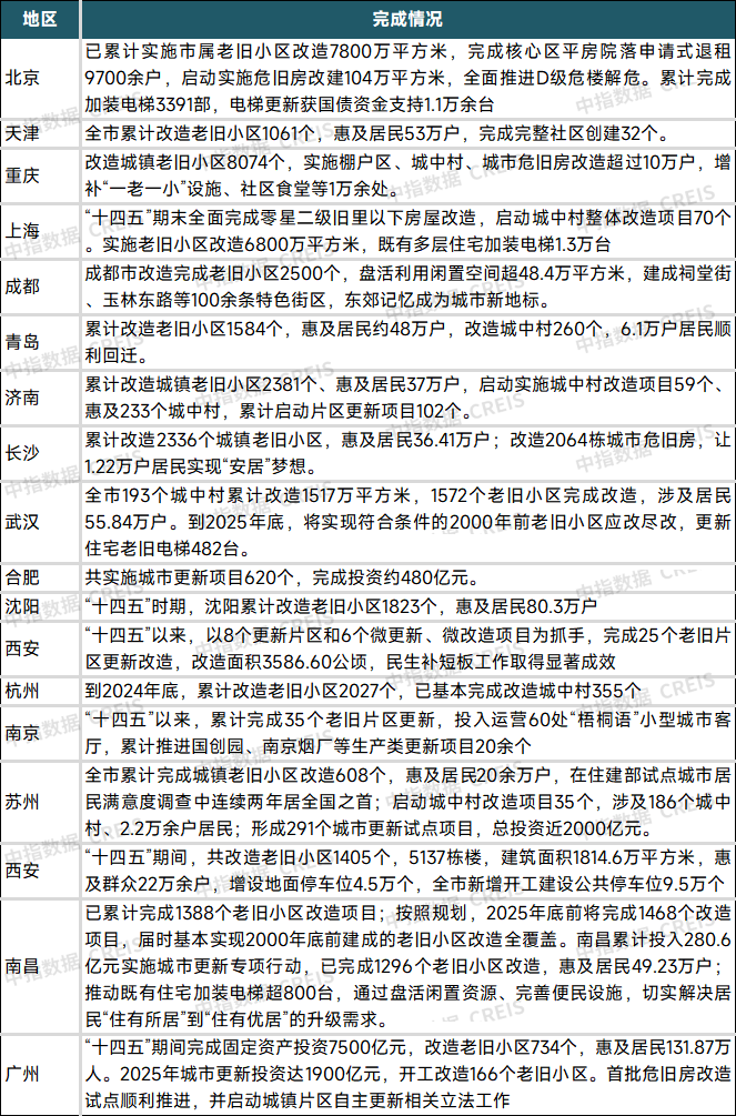 从地方层面来看,老旧小区是“十四五”期间发展的重中之重,各地均取得规模化成效,聚焦居民急难愁盼问题补齐居住短板。多数省份改造量达数千个甚至上万个,惠及百万级居民:四川省改造老旧小区3.29万个,惠及群众339.24万户,规模居全国前列;湖北省、湖南省改造量均超1.8万个,惠及居民分别达270万户、36.41万户。投资规模方面,各地加大城市更新资金投入,项目数量与投资体量保持高位运行。部分省份投资规模突破万亿级,河南省完成投资10918亿元,江西省超1.2万亿元。此外,各地结合资源禀赋与发展需求,形成差异化更新模式,吉林省对四片历史文化街区整治提升并开街运营,修缮30多个历史建筑;济南市、成都市聚焦特色街区打造,成都建成祠堂街、玉林东路等100余条特色街区,东郊记忆成为城市新地标,实现“修旧如旧”与功能焕新。